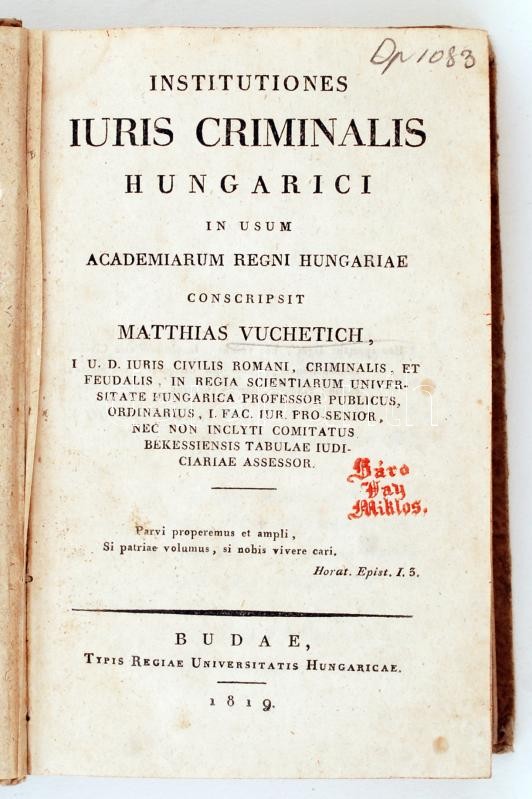 Matthias Vuchetich: Intitutiones Iuris Criminalis Hungarici in usum Academiarum Regni Hungariae... Budae, 1819, Universitatis Hungaricae. Kopottas karton kötésben.