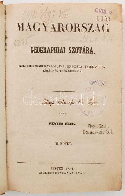 Fényes Elek: Magyarország geographiai szótára, mellyebn minden város, falu és puszta, betürendben körülményesen leiratik. III-IV. kötet. Pesten, 1851, Kozma Vazulnál. Kopottas félbőr kötésben.