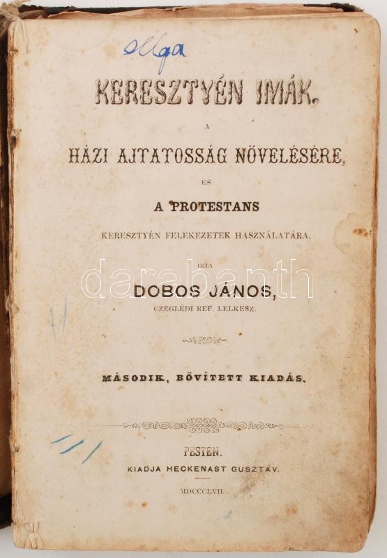 Dobos János: Keresztyén imák a házi ájtatatosság növelésére, és a protestans keresztyén felekezetek használatára. Pesten, 1857, Heckenast. Kopottas kiadói, dombornyomott egészbőr kötésben, gerincnél elvált.
