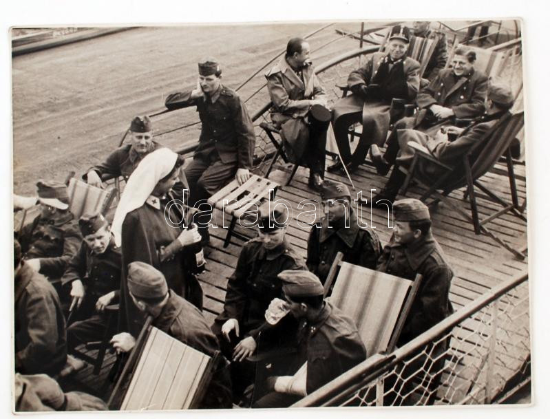 Leírás: cca 1940 Háborús sebesült magyar katonák, tisztek ápolónővel, Magyar Fotóriport Iroda, pecséttel jelzett fotó, 23x17 cm