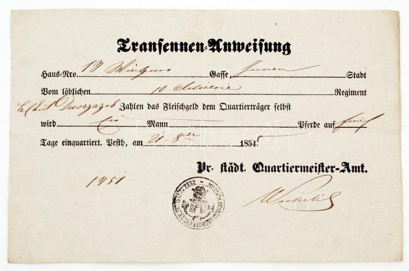 1854 Pest, A szállásmesteri hivatal által kiállított igazolás https://www.darabanth.com/hu/230-Gyorsarveres/230.0/Festmeny-mutargy-papirregiseg-egyeb/Okmanyok~200030/1854-Pest-A-szallasmesteri-hivatal-altal-kiallitott-igazolas~II1032752