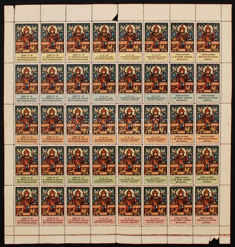 Leírás: 1938 BUDAPEST III. Országos Magyar Bélyegkiállítás levélzáró 40-es hajtott teljes ív 30 különféle levélzáróval