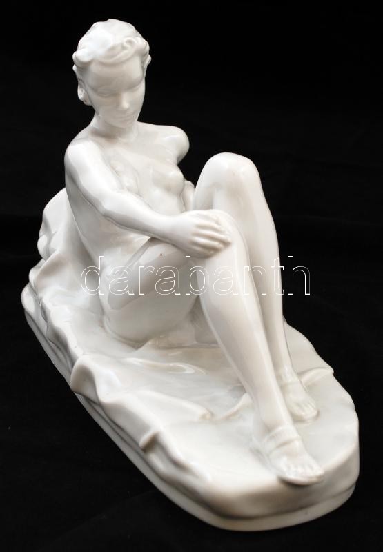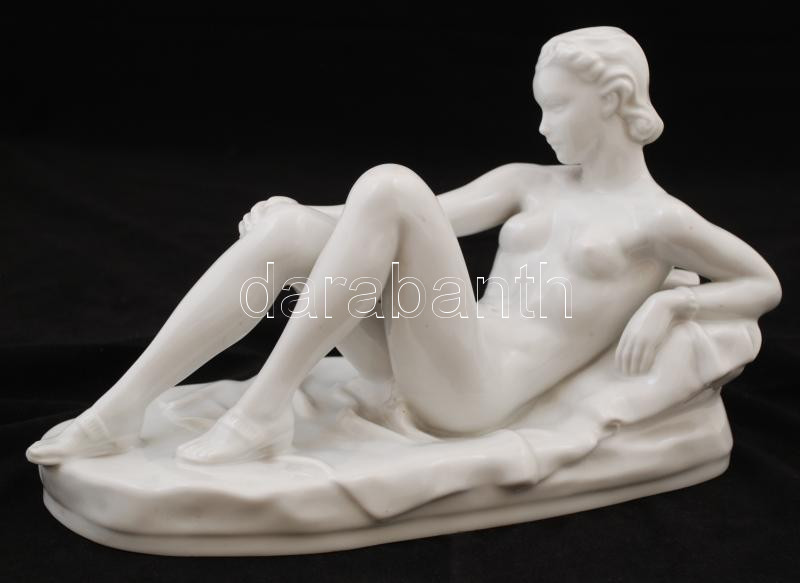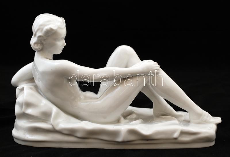 Leírás: Drasche fekvő akt, fehér mázas, jelzett, hibátlan, apró foltokkal, h:23 cm, m:14 cm