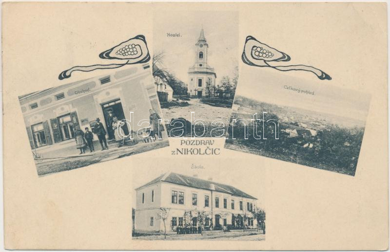 Leírás: Nikolcice, Kostel, Skola, Obchod / church, school, shop Art Nouveau (EK)