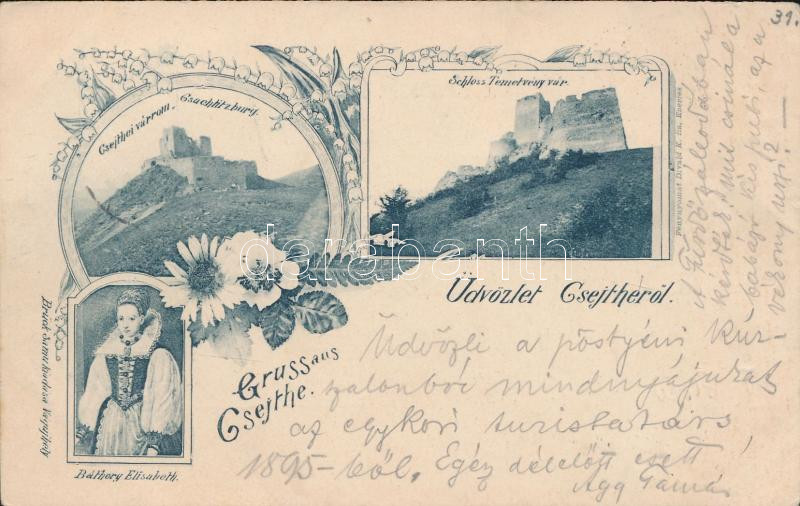 Leírás: 1898 Csejte, Temetvény vár, Csejthei várrom, Báthory Erzsébet; kiadja Brück Samu / castles ruins, Báthory, floral Art Nouveau (EB)