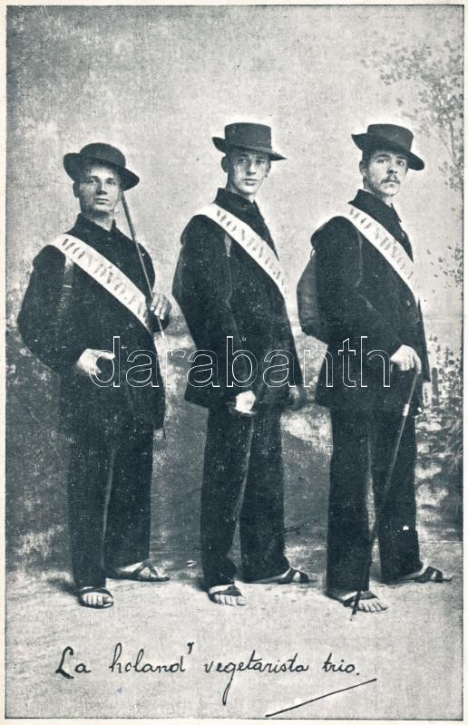 Leírás: A három hollandi vegetáriánus, világutazók / Dutch vegetarian world travelers G. Perfors, F. v. d. Hoorn, A. Mossel (b)