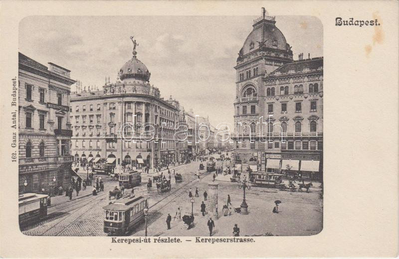 Leírás: Budapest VIII. Kerepesi út, villamos, Zálogkölcsön intézet, Székely Testvérek üzlete, Drogéria gyógyszertár, kiadja Ganz Antal 162.