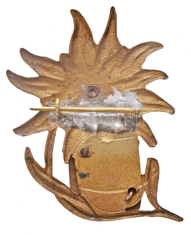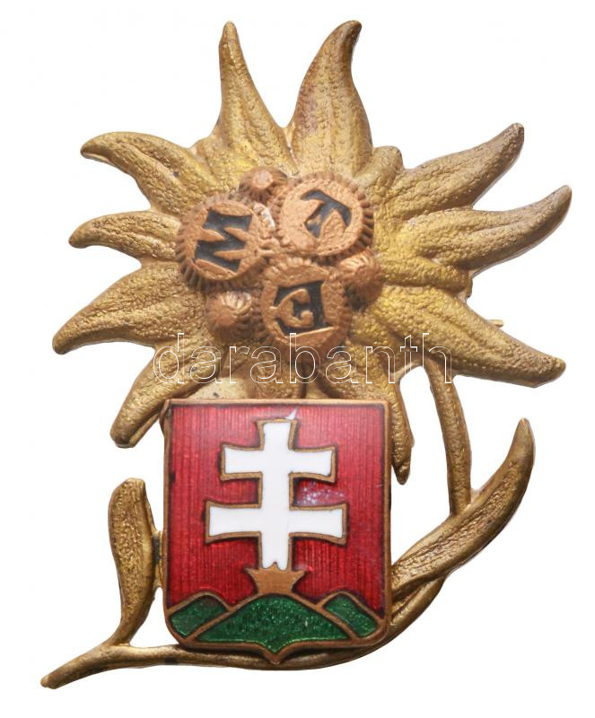 ~1930. "Magyar Turista Egyesület" hivatalos jelvénye, zománcozott fém (havasi gyopár benne körben MTE, alul kapcsolódik hozzá a pajzs a kettős kereszttel), (41x31,5mm) T:2