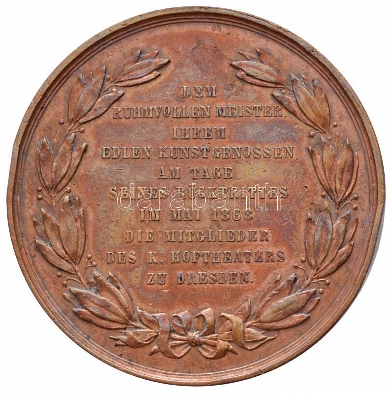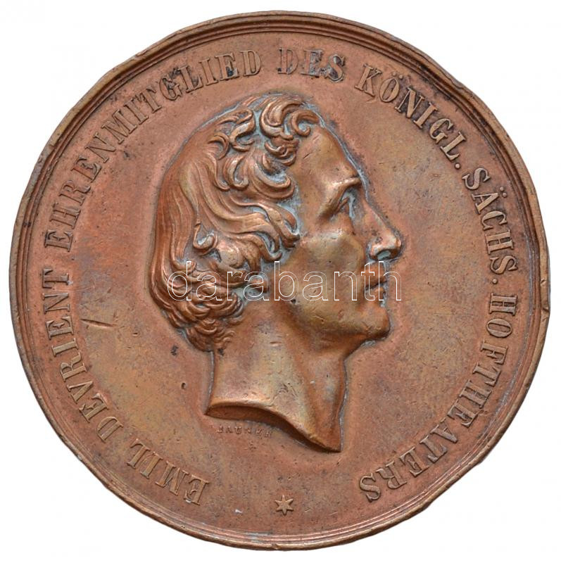 German States / Saxony 1868. "Emil Devrient" Br commemorative medallion. "EMIL DEVRIENT EHRENMITGLIED DES KÖNIGL. SäCHS. HOFTHEATERS / DEM RUHMVOLLEN MEISTER IHREM EDLEN KUNSTGENOSSEN, AM TAGE SEINES RÜCKTRITTES IM MAI 1868 DIE MITGLIEDER DES K. HOFTHEATERS ZU DRESDEN". Sign.: Heinrich Jauner (50mm) C:VF edge error