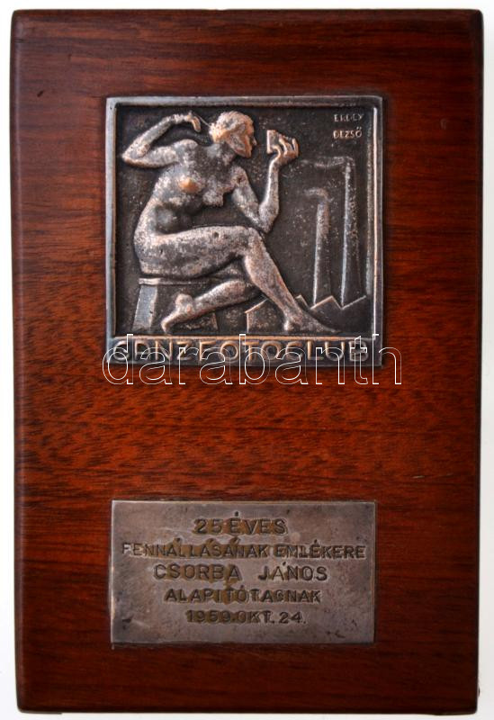 Leírás: Erdey Dezső (1902-1957) 1959. "Ganz Foto Club - 25 éves fennállásának emlékére, Csorba János alapítótagnak" fém plakett falapon T:2-