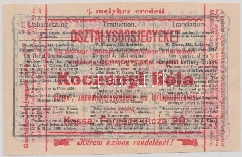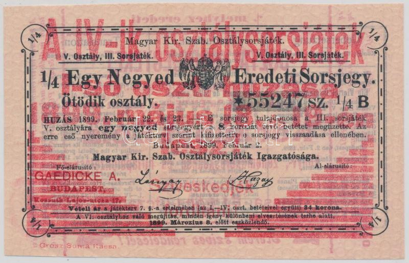 Leírás: Budapest 1899. "Magyar Királyi Szabadalmazott Osztálysorsjáték - 1/4 Eredeti Sorsjegy - Ötödik osztály" sorsjegy felülbélyegzéssel T:II-,III
