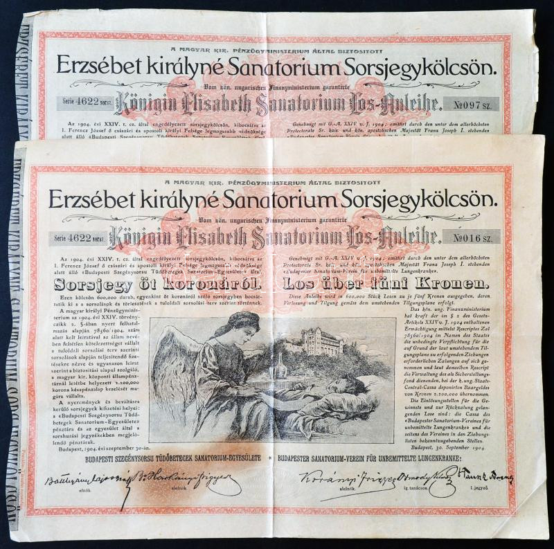 Budapest 1904. "Erzsébet királyné Sanatorium Sorsjegykölcsön" sorsjegy... https://www.darabanth.com/hu/230-Gyorsarveres/230.0/Numizmatika/Reszvenyek-es-sorsjegyek~400006/Budapest-1904-Erzsebet-kiralyne-Sanatorium-Sorsjegykolcson-sorsjegye-5K-rol-szarazpecset~II1019887