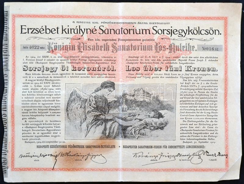 Leírás: Budapest 1904. "Erzsébet királyné Sanatorium Sorsjegykölcsön" sorsjegye 5K-ról, szárazpecséttel (2x) T:III