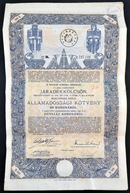 Budapest 1914. "A Magyar Korona Országai 6%-kal Kamatozó Járadékkölcsön - Államadóssági Kötvény" 100K-ról, szelvényekkel, bélyegzéssel és szárazpecséttel T:III