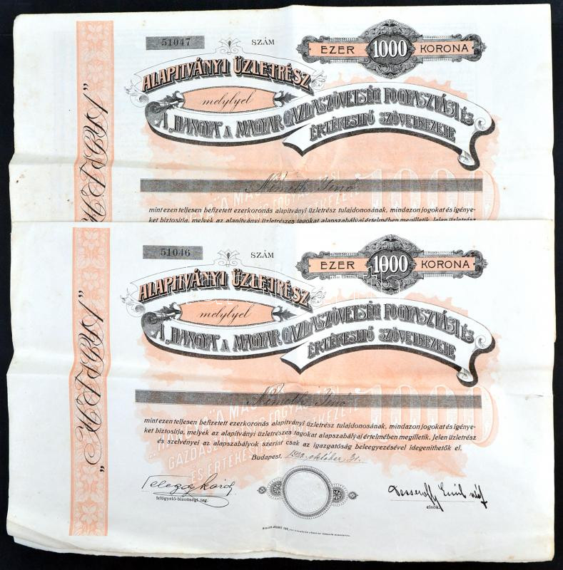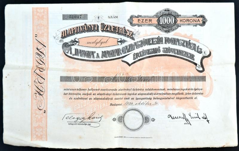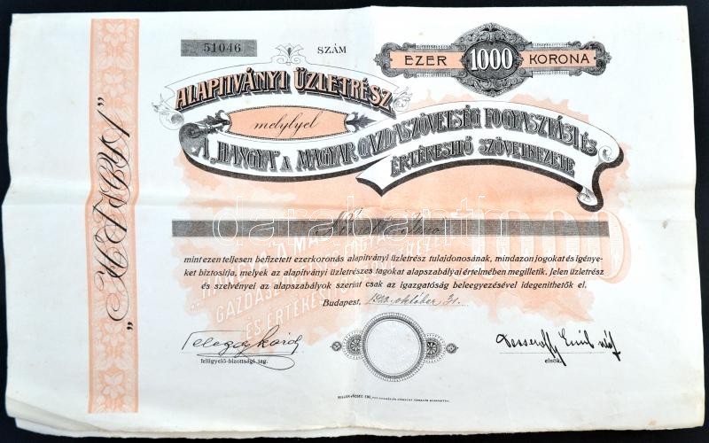Budapest 1922. "A 'HANGYA' a Magyar Gazdaszövetség Fogyasztási és Értékesítő Szövetkezete" alapítványi üzletrész 1000K-ról, szárazpecséttel, szelvényekkel T:III