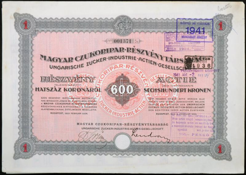 Leírás: Budapest 1923. "Magyar Czukoripar-Részvénytársaság" részvénye 600K-ről szelvényekkel, felülbélyegzésekkel T:I-,II hajtatlan