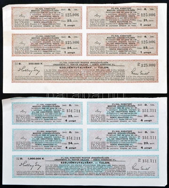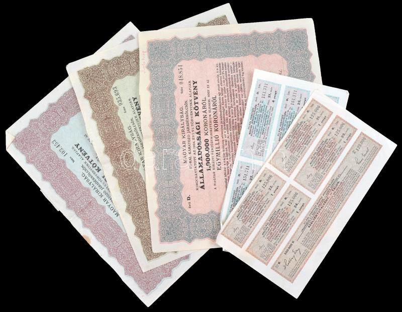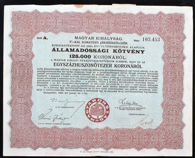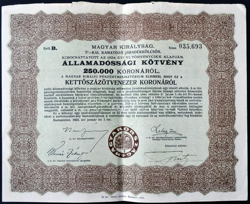 Leírás: Budapest 1925. "Magyar Királyság 5%-kal kamatozó Járadékkölcsön" államadóssági kötvény 125.000K, 250.000K, 1.000.000K, közte szelvények is T:II-,III