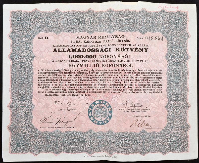 Budapest 1925. "Magyar Királyság 5%-kal kamatozó Járadékkölcsön" állam... https://www.darabanth.com/hu/230-Gyorsarveres/230.0/Numizmatika/Reszvenyek-es-sorsjegyek~400006/Budapest-1925-Magyar-Kiralysag-525-kal-kamatozo-Jaradekkolcson-allamadossagi-kotveny-1~II1018668