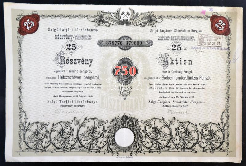 Leírás: Budapest 1935. "Salgó-Tarjáni Kőszénbánya Részvény-Társulat" 25 részvénye egyenként 30P-ről, összesen 750P-ről, szárazpecséttel, bélyegzéssel, szelvények NÉLKÜL! T:III