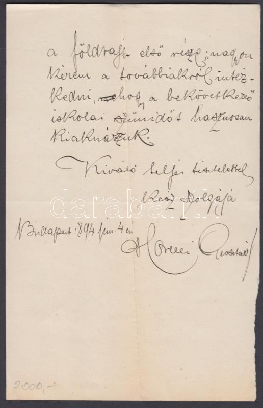 Leírás: 1894 Bp., Horelli Gusztáv saját kézzel írt levele és aláírása