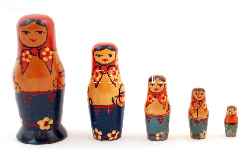 Matrjoska baba, öt darabos, m: 13 cm https://www.darabanth.com/hu/231-Gyorsarveres/231.0/Festmeny-mutargy-papirregiseg-egyeb/Bolhapiac~600010/Matrjoska-baba-ot-darabos-m-13-cm~II1017857