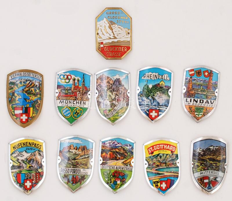 Leírás: Modern botjelvények, 11 db (St.Gotthard, Passo Falzarego, Mittersill, Großglockner, Lindau im Bodensee, stb.)