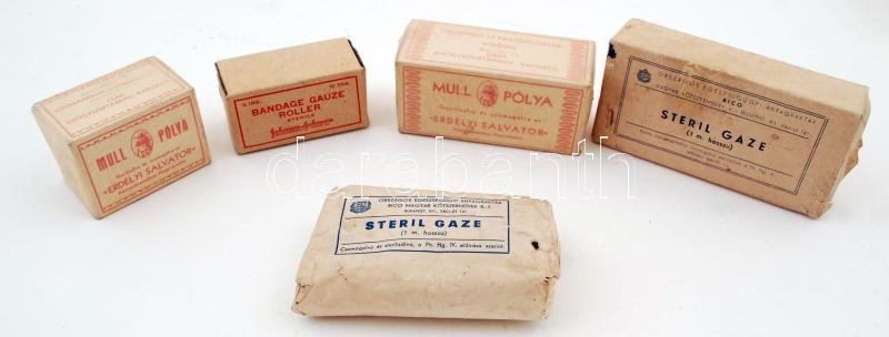 Leírás: Országos Egészségügyi Anyagraktár által kiadott steril géz, Erdélyi Salvator mull pólya, Johnson&Johnson steril géz, összesen 5 db