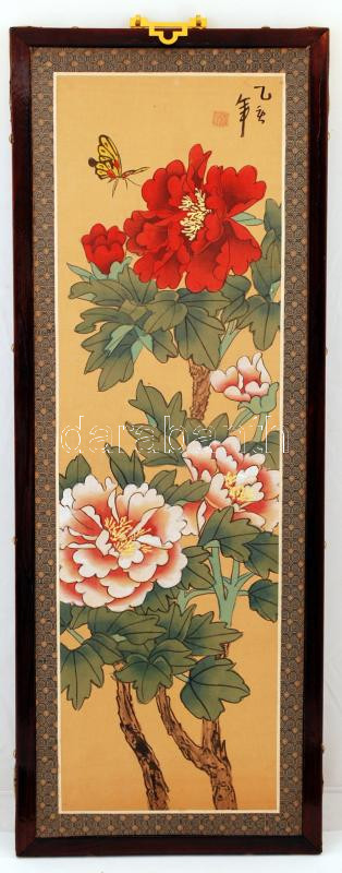 Leírás: Hibiszkuszok, távol-keleti festmény, vegyes technika, selyem, jelzett, díszes fa keretben, 79×24 cm