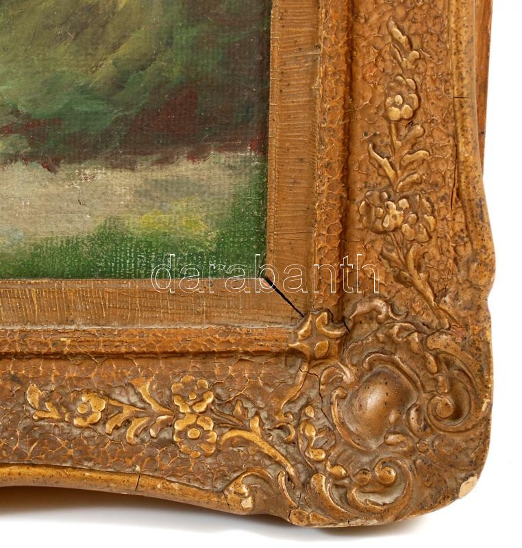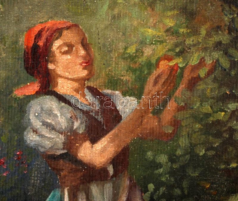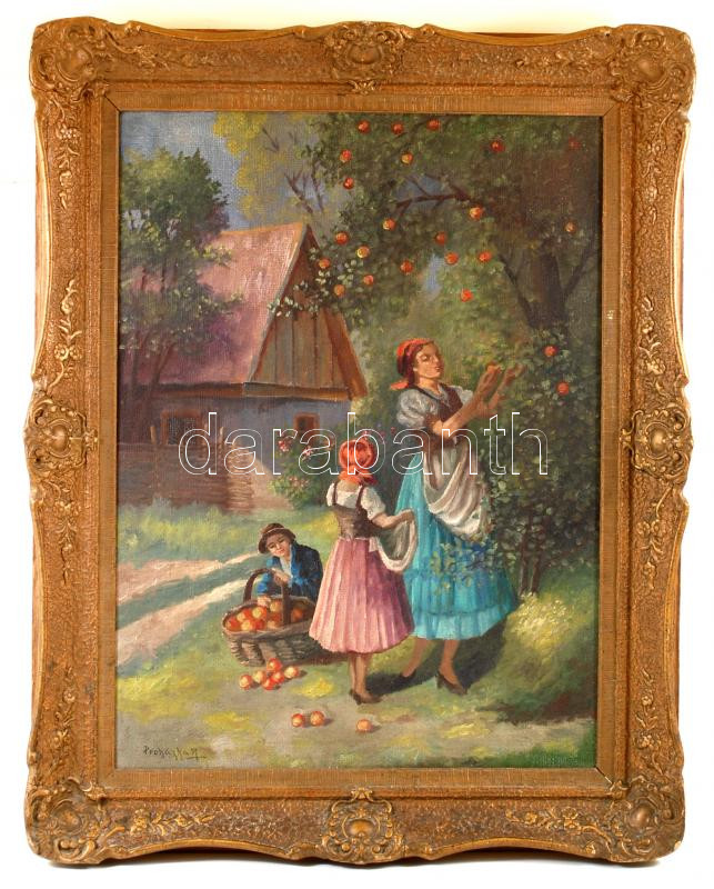 Leírás: Prohászka József (1886-1964): Almaszedés. Olaj, vászon, jelzett, antik keretben, 80×60 cm