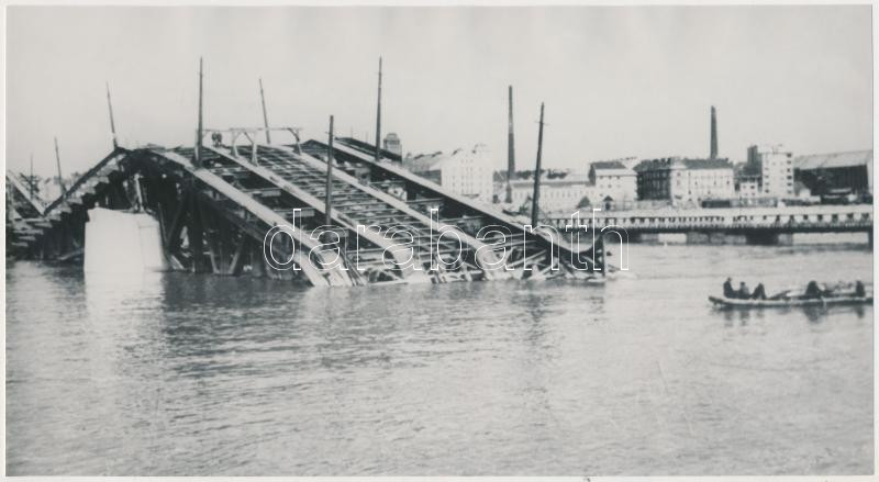 Leírás: 1945 A felrobbantott Horthy Miklós híd Budapesten, Dr. Kunszt János (1892–1960) hagyatékában levő negatívról készült későbbi nagyítás, 13x24 cm