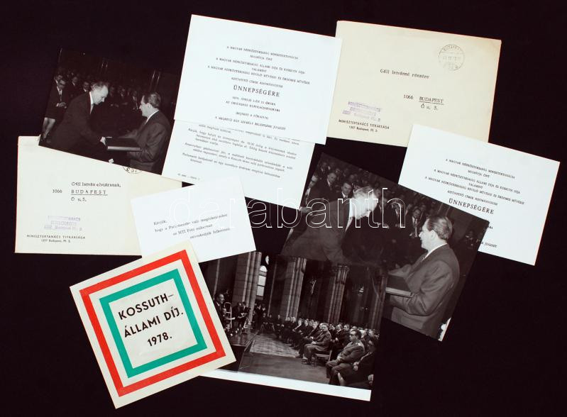 Leírás: 1978 Gáll István(1931-1982) író átveszi a Kossuth-díjat, 2 db fotó 2 db meghívóval, 18x13 cm