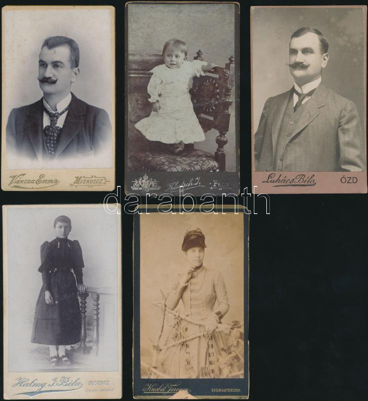 cca 1860-1890 Korabeli, keményhátú családi fotók, 5db, mind különböző vidéki műtermekből: Váncza (Miskolcz), Klutsch (Pécsett), Lukács (Ózd), Halmy (Salgótarján),Knebel (Szombathelyen), cca10x6cm