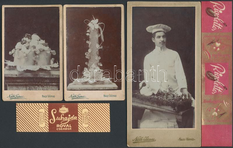 cca 1910-1920 Suhajda József(1886-1948) cukrász, csokoládégyáros a győztes süteménnyel, 3 másik süteményről készült fotója, 2 db csokipapírral, keményhátú fotók, 7x11 és 8x16 cm