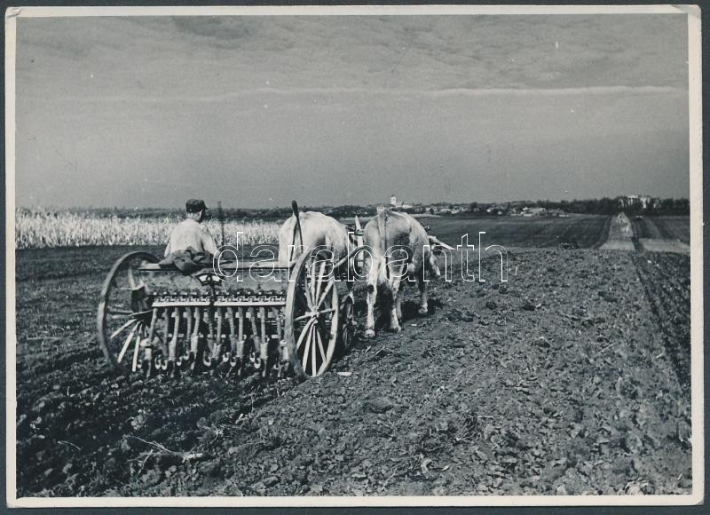 Leírás: cca 1948 Tiszavölgyi József: Tavaszi vetés, pecséttel jelzett vintage fotó, 9x12 cm