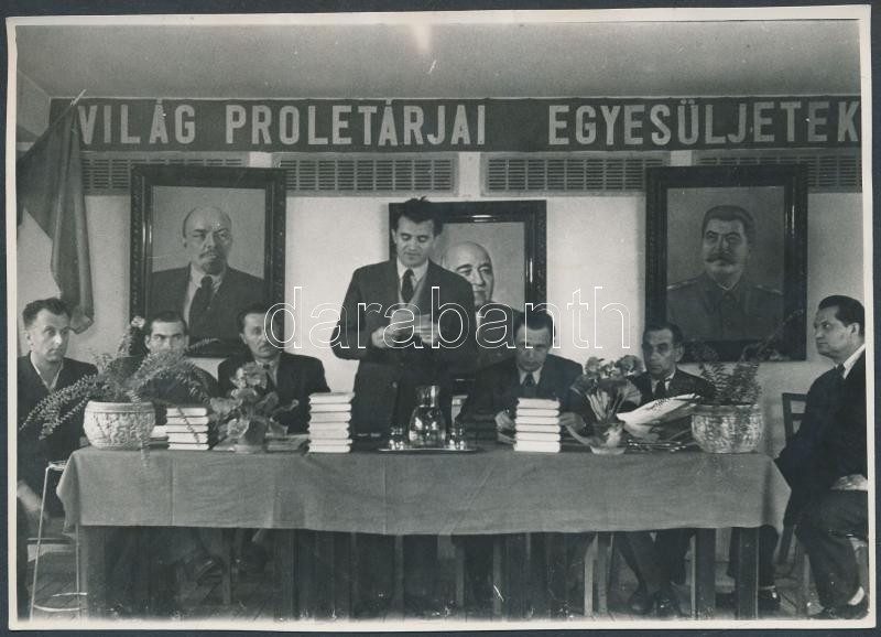 cca 1953 Tiszavölgyi József: Ünnepség a BSZKRt-nél, Lenin, Rákosi és Sztálin figyelő tekintete előtt, jelzetlen riportfotó a szerző hagyatékából, 13x18 cm