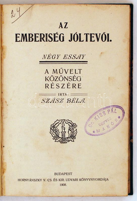 2db könyv. Szász Béla: Az emberiség jótevői. Negy essay. A művelt közönség részére. Budapest, 1908, Hornyánszky.