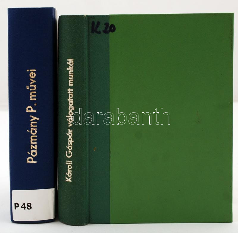 2 db vallási témájú könyv: Pázmány Péter művei. Vál. Tarnóc Márton. Bp., 1983, Szépirodalmi Könyvkiadó. Későbbi félvászon kötésben, jó állapotban.; Károli Gáspár válogatott munkái. Összeáll. Vargha Balázs. Bp., 1958, Magvető. Későbbi félvászon kötésben, jó állapotban.