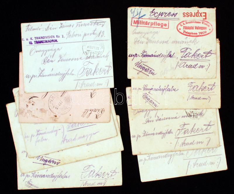 Leírás: cca 1915-1916 Tábori postán keresztül küldött levelek az orosz frontról, Cholm, K.k. Krankenhaus Wieden és egyéb pecsétekkel, 9 db