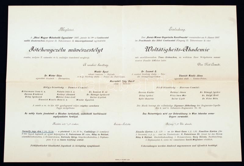 Leírás: 1897 Meghívó a "Bécsi Magyar Műkedvelők Egyesületének" a Continental szálló dísztermében táncvigalommal egybekötött jótékony célú művészestélyére