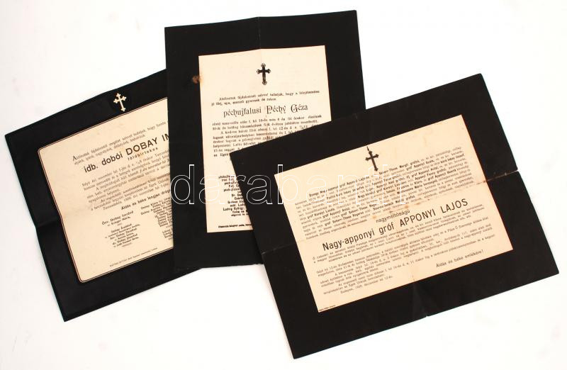 1909-1911 3 db régi gyászjelentés(Dobay Imre földbirtokos, gróf Appony... https://www.darabanth.com/hu/231-Gyorsarveres/231.0/Festmeny-mutargy-papirregiseg-egyeb/Nyomtatvanyok~600027/1909-1911-3-db-regi-gyaszjelentesDobay-Imre-foldbirtokos-grof-Apponyi-Lajos-Pechy-Geza~II1042820
