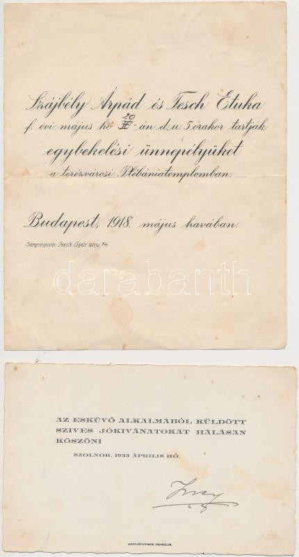 1918-1936 Eljegyzési és esküvői értesítők, 5 db https://www.darabanth.com/hu/231-Gyorsarveres/231.0/Festmeny-mutargy-papirregiseg-egyeb/Nyomtatvanyok~600027/1918-1936-Eljegyzesi-es-eskuvoi-ertesitok-5-db~II1046076