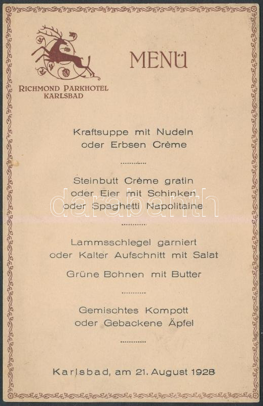 1928 Karlsbad Hotel menükártya / Menu card https://www.darabanth.com/hu/231-Gyorsarveres/231.0/Festmeny-mutargy-papirregiseg-egyeb/Nyomtatvanyok~600027/1928-Karlsbad-Hotel-menukartya-Menu-card~II978906
