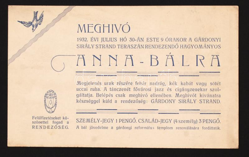 Leírás: 1932 Gárdony, Meghívó a Gárdonyi Sirály Strand teraszán rendezendő hagyományos Anna-bálra, dresszkóddal