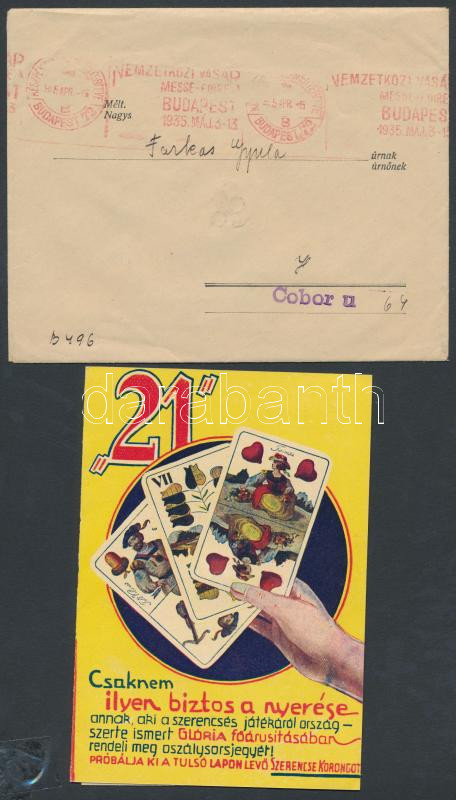Leírás: 1935 Bp., A Glória Kereskedelmi R.T. osztálysorsjáték főárusító sorsjegye levelezőlappal, borítékban