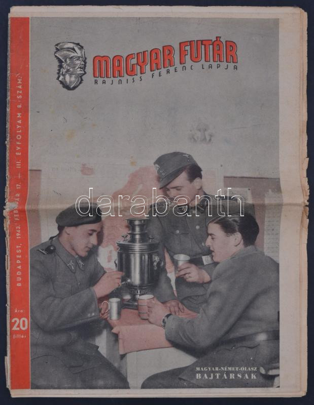 1943 Bp., A Magyar Futár, Rajniss Ferenc lapja III. évfolyamának 8. száma, sok fotóval és érdekes háborús hírrel: Honvédeink új védelmi állásban, bandaharcok a front mögött, Japáné a jövő keletázsiában stb.