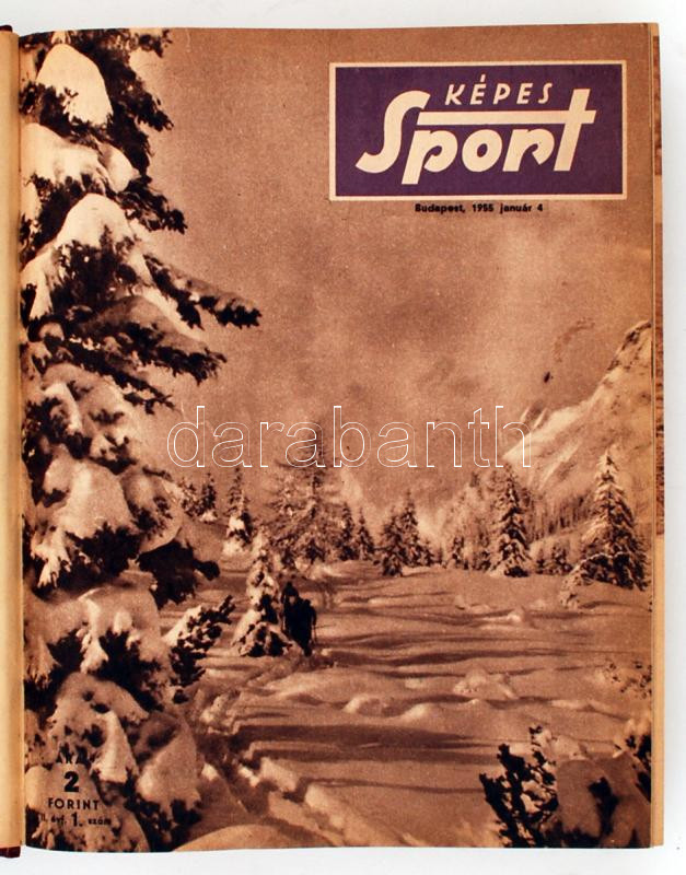 1955 Képes Sport. Az Országos Testnevelési és Sportbizottság Hetilapja. 1. szám 2. évfolyam. -2 évfolyam 52. szám. 1955 január 4. -1955 december 27. Sok érdekes hÃrrel: Puskás a Bp. Honvéd ill. a válogatott játékosaként, az Aranycsapat sikerei, Pap Lászlóval kapcsolatos eseményekkel, Iharos 3000 méteres sÃkfutás világcsúcsa, Kosár EB stb.