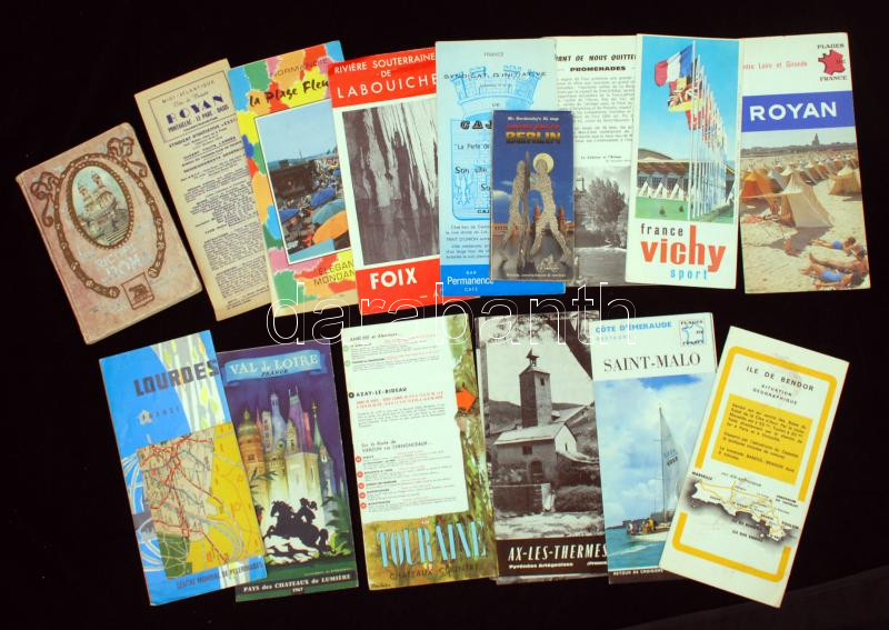 cca 1930-1970 Régi Ricordo di Roma leporello(1 db), és későbbi színes utazási prospektusok(Berlin várostérkép, Normandia, Lourdes, stb.), 16 db /