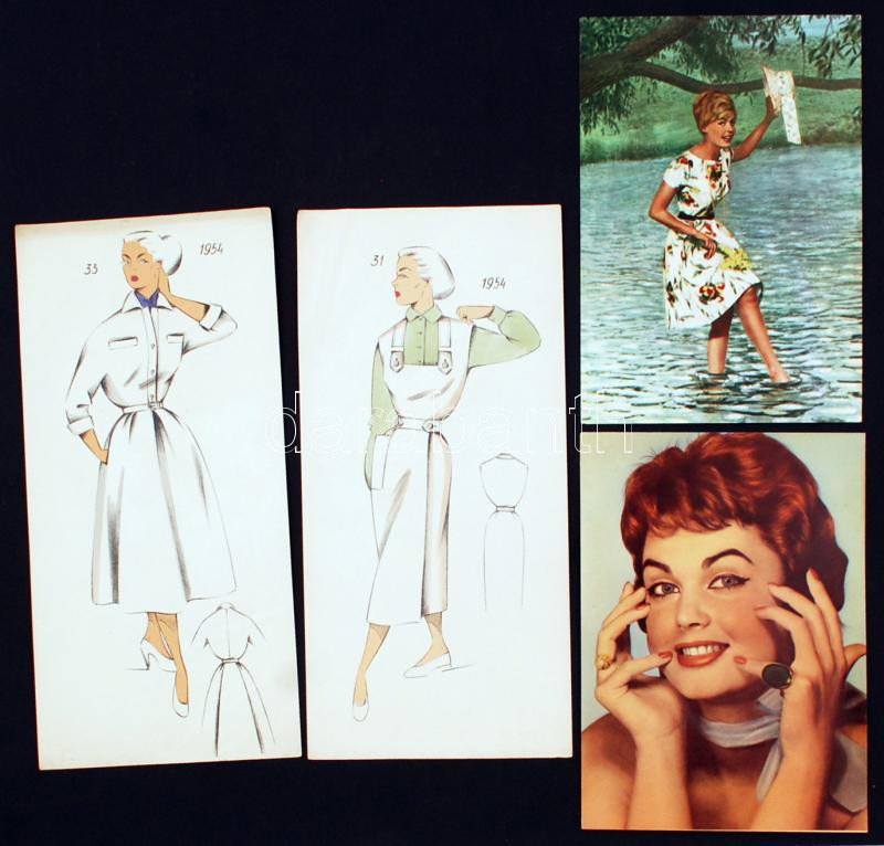Leírás: cca 1954-1960 Női ruhák, 2 db színes ruhaterv, 14x29 cm, 2 db színes plakátterv, 14x21 cm