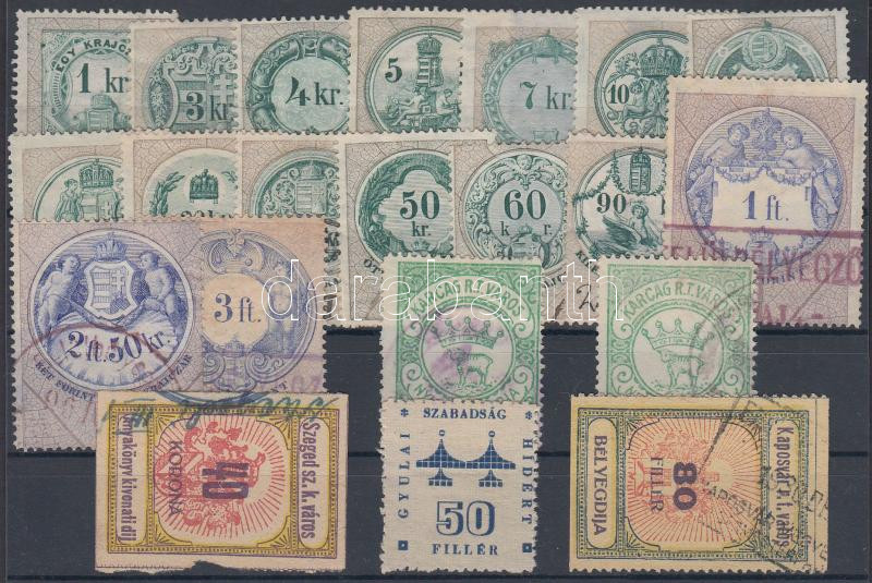 Leírás: 16 db régi okmánybélyeg + 5 klf városi okmánybélyeg