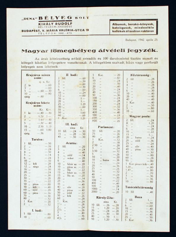 1942 Bp.V., A "Duna" Bélyegbolt Király Rudolf bélyegkereskedésének mag... https://www.darabanth.com/hu/231-Gyorsarveres/231.0/Festmeny-mutargy-papirregiseg-egyeb/Okmanyok~600015/1942-BpV-A-Duna-Belyegbolt-Kiraly-Rudolf-belyegkereskedesenek-magyar-tomegbelyeg-atvet~II1042210